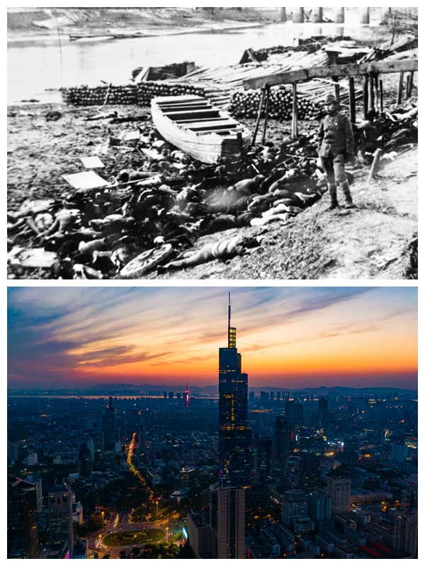 上圖為1937年12月中旬,日本侵略軍攻占中國南京后,對中國老百姓進(jìn)行了空前的慘無人道的大屠殺。在南京城西一條流往長江的小河邊,被日本侵略軍殺害的中國人,尸體遍地血流成河。