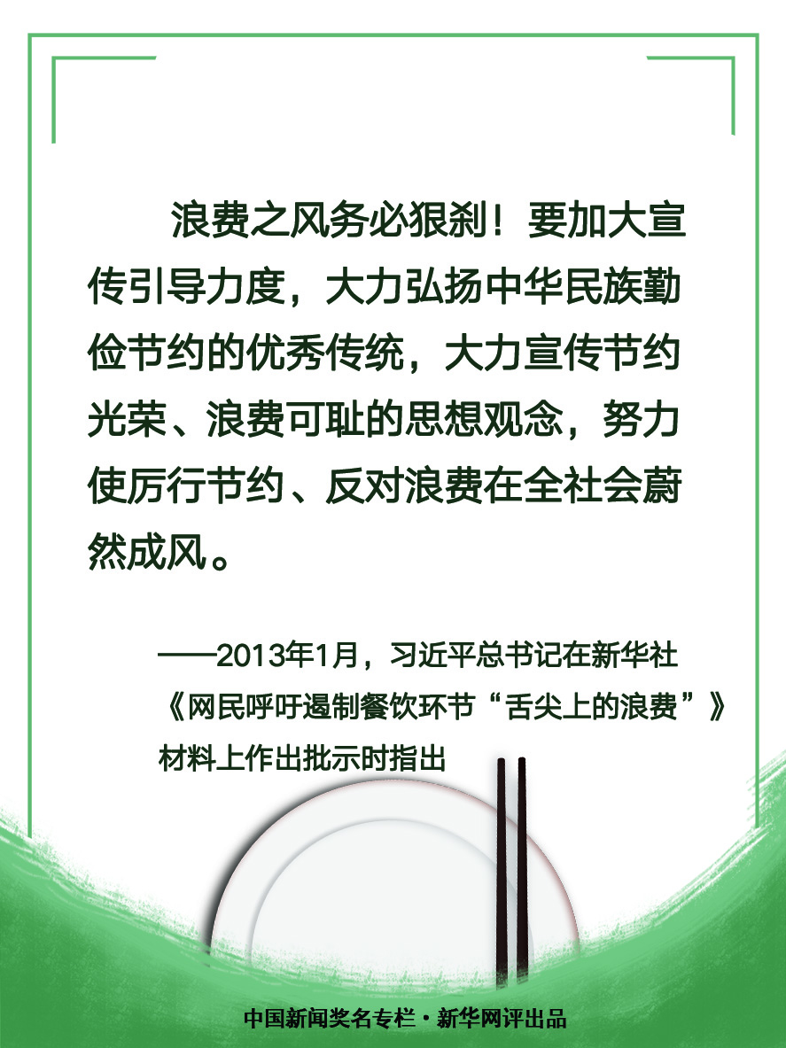 民以食為天,食以儉養(yǎng)德。餐飲浪費(fèi)現(xiàn)象存在著巨大危害,全社會(huì)必須深刻認(rèn)識(shí)勤儉節(jié)約的重要性。當(dāng)務(wù)之急,各地各部門、各餐飲機(jī)構(gòu)、每個(gè)人都要行動(dòng)起來(lái),采取加強(qiáng)立法、強(qiáng)化監(jiān)管、加強(qiáng)宣傳教育等舉措,從我做起,從小事做起,進(jìn)一步營(yíng)造勤儉節(jié)約之風(fēng)。(文字:馬若虎 海報(bào):張倩)