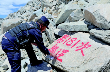 索朗達(dá)杰在崗布冰川巡邏時(shí),在石塊上標(biāo)記巡邏次數(shù)。 本報(bào)記者劉小草攝