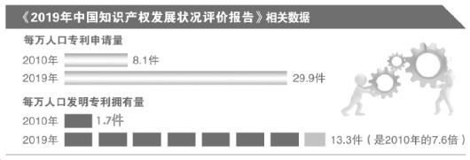 近日,國家知識產(chǎn)權(quán)局知識產(chǎn)權(quán)發(fā)展研究中心發(fā)布《2019年中國知識產(chǎn)權(quán)發(fā)展?fàn)顩r評價(jià)報(bào)告》(以下簡稱《報(bào)告》)?!秷?bào)告》顯示,從2010年到2019年,每萬人口專利申請量由8.1件增加到29.9件,每萬人口發(fā)明專利擁有量在2019年達(dá)到13.3件,是2010年的7.6倍;每萬人口商標(biāo)申請量由7.0件增加到53.3件;每萬人口著作權(quán)登記量由3.4件提高到30件。
