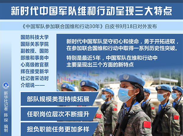 新華社北京9月18日電(記者黎云、張汨汨)《中國軍隊參加聯(lián)合國維和行動30年》白皮書18日對外發(fā)布。國防科技大學國際關系學院副教授、國防部維和事務中心高級教官蔡輝在接受新華社記者采訪時介紹說,新時代中國軍隊堅守初心和使命,勇于開拓進取,在參加聯(lián)合國維和行動中取得一系列歷史性突破。特別是最近5年,中國軍隊在維和行動中主要呈現出三個方面的新特點。
