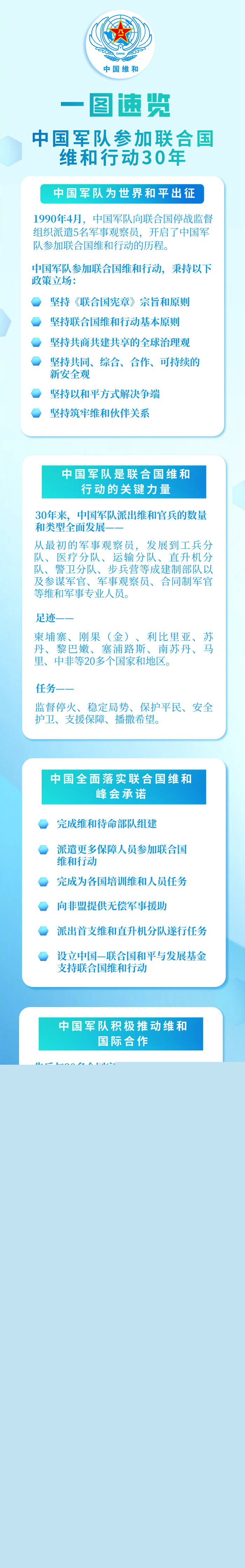 30年來,中國軍隊始終認真踐行《聯(lián)合國憲章》宗旨和原則,堅定支持聯(lián)合國在維和行動中的主導地位,支持聯(lián)合國通過改革構(gòu)建更加完善的維和行動體系。