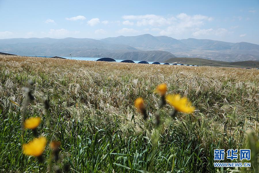 東達村的青稞迎來豐收,遠處藍色頂棚建筑是東達村養(yǎng)殖場。新華網(wǎng)記者焦鵬攝