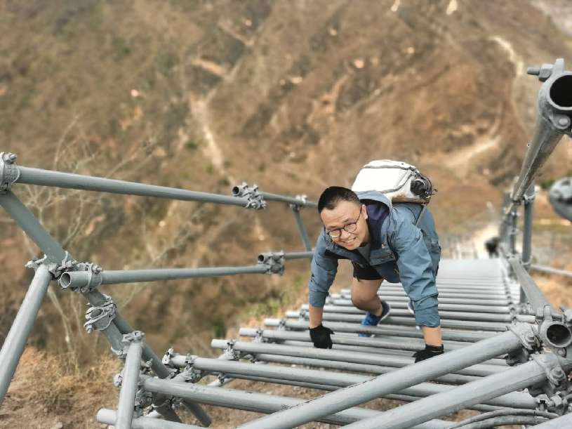 四川日報記者侯沖攀爬鋼梯進入“懸崖村”采訪途中