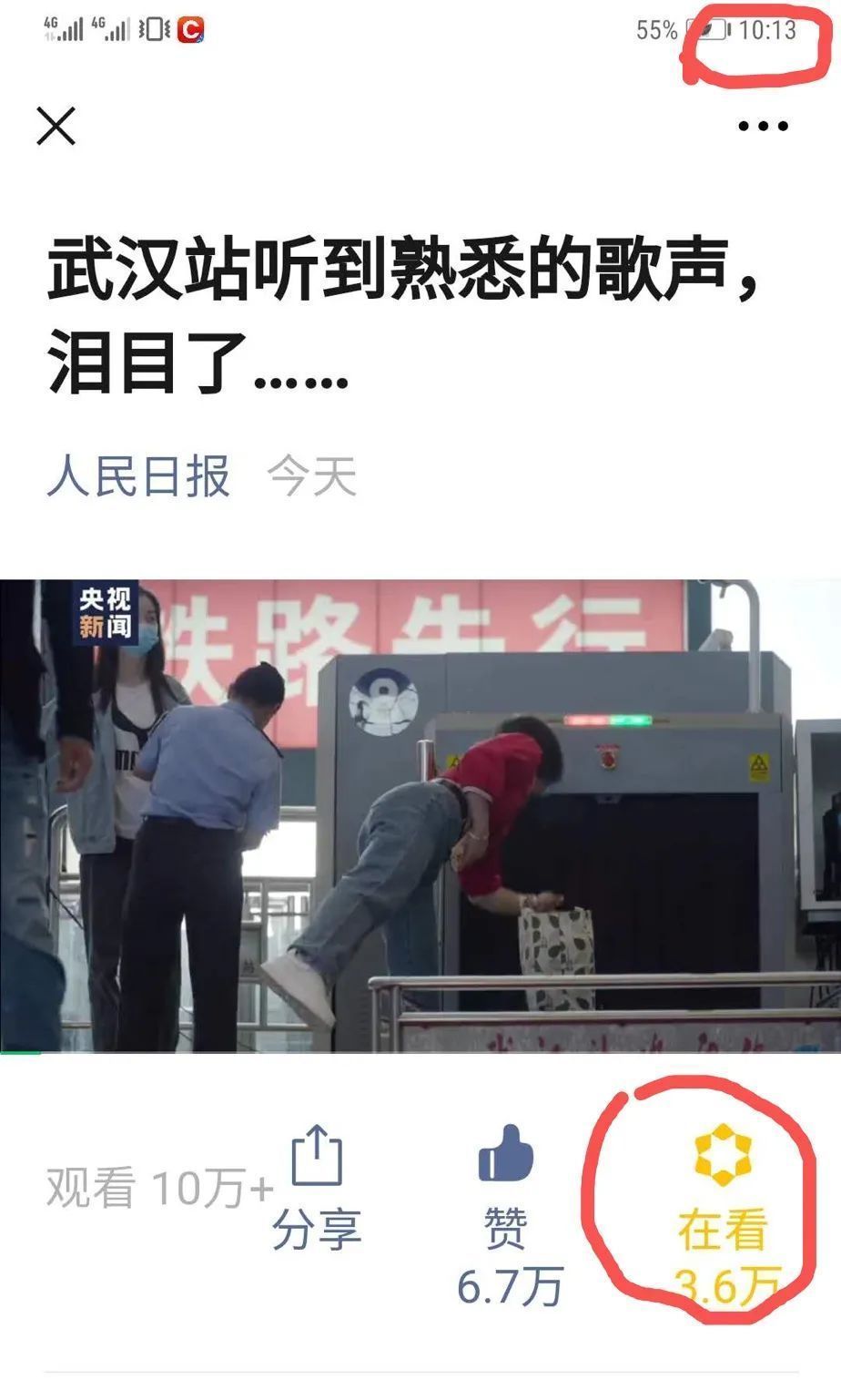 首先是央視的重磅炸彈,簡(jiǎn)直一個(gè)接一個(gè):早起就被一條《當(dāng)武漢火車站響起熟悉的歌聲……》的快閃新聞?wù)鸬盟查g淚奔。單是那前奏一起,看到如今擠擠挨挨的武漢火車站現(xiàn)場(chǎng)、交織著那曾經(jīng)至暗時(shí)刻的回憶,心疼、感動(dòng)、自豪……種種情愫油然而生!當(dāng)張定宇出現(xiàn)在鏡頭里,畫面定格在“這是英雄的祖國(guó)”,那一刻,心真的是知道了什么叫“DUANG”一下!快閃之后,現(xiàn)場(chǎng)群眾最多說(shuō)到的“不容易”和“安全感”,真是大家的心聲。也正是因?yàn)槿绱?,人民日?qǐng)?bào)微信公號(hào)16:36轉(zhuǎn)發(fā)這條視頻后,晚上10點(diǎn)剛過(guò),在看量就已經(jīng)達(dá)到3.6萬(wàn)——人心所向,可見一斑。