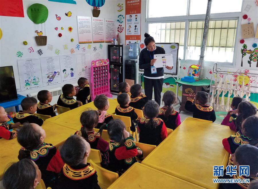 昭覺(jué)縣火普村幼教點(diǎn)老師在給孩子們上課。攝于2019年3月。新華社發(fā)