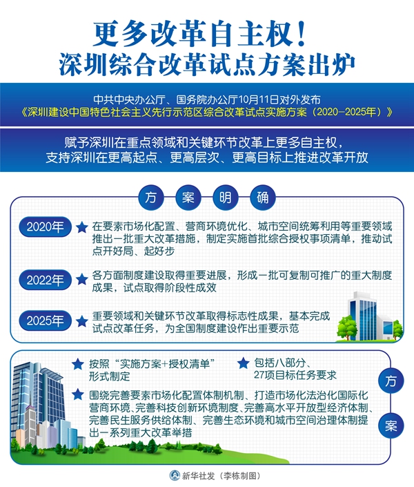 新華社北京10月11日電(記者安蓓、葉前)中共中央辦公廳、國務(wù)院辦公廳11日對外發(fā)布《深圳建設(shè)中國特色社會主義先行示范區(qū)綜合改革試點(diǎn)實(shí)施方案(2020-2025年)》,賦予深圳在重點(diǎn)領(lǐng)域和關(guān)鍵環(huán)節(jié)改革上更多自主權(quán),支持深圳在更高起點(diǎn)、更高層次、更高目標(biāo)上推進(jìn)改革開放。