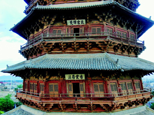 歷經(jīng)風(fēng)雨侵蝕、地震損傷、戰(zhàn)火破壞,木塔塔體已扭曲變形。尤其是二十世紀(jì)三十年代,木塔二到五層的夾泥墻被人為拆除,對(duì)木塔結(jié)構(gòu)產(chǎn)生了嚴(yán)重影響。