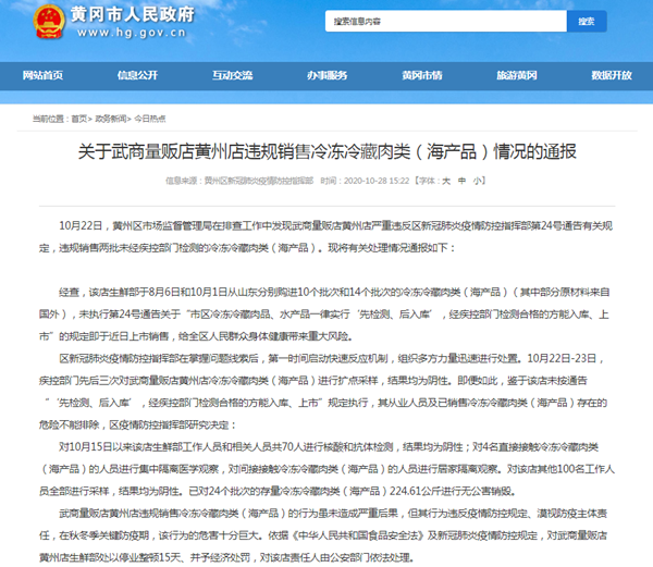 10月22日,黃州區(qū)市場監(jiān)督管理局在排查工作中發(fā)現(xiàn)武商量販店黃州店嚴(yán)重違反區(qū)新冠肺炎疫情防控指揮部第24號通告有關(guān)規(guī)定,違規(guī)銷售兩批未經(jīng)疾控部門檢測的冷凍冷藏肉類(海產(chǎn)品)?,F(xiàn)將有關(guān)處理情況通報(bào)如下: