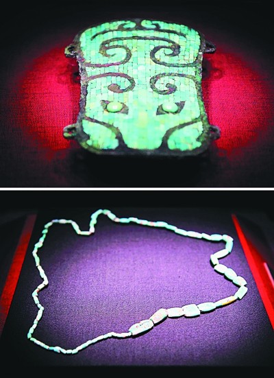 二里頭夏都遺址博物館展品“鑲嵌綠松石獸面紋銅牌飾”(上)和“綠松石串珠”(下)(拼版照片)。新華社記者 李安攝