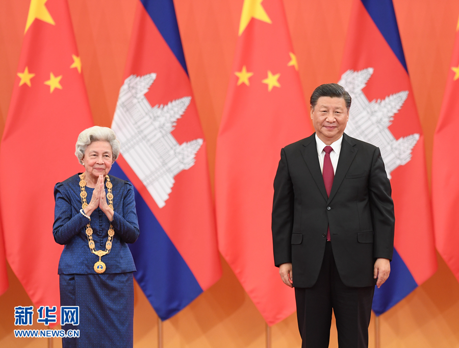 11月6日,國家主席習近平在北京人民大會堂為柬埔寨太后莫尼列舉行中華人民共和國“友誼勛章”頒授儀式。 新華社記者 申宏 攝