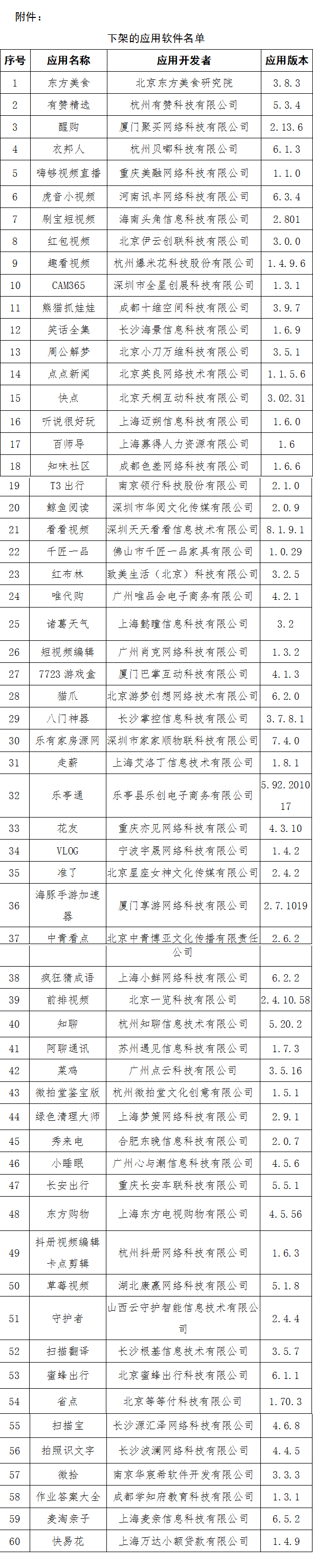 新華社北京11月10日電(記者張辛欣)工信部10日通報,截至目前,經(jīng)第三方檢測機構核查復檢,有贊精選、紅布林等60款App存在侵害用戶權益行為且未按照要求完成整改。依據(jù)有關法律和規(guī)范性文件要求,工信部組織對上述App進行下架。