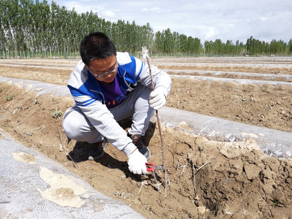2019年春季,呼延瑋在蘭干村扶貧果園修剪嫁接后的樹苗。(采訪對象供圖)