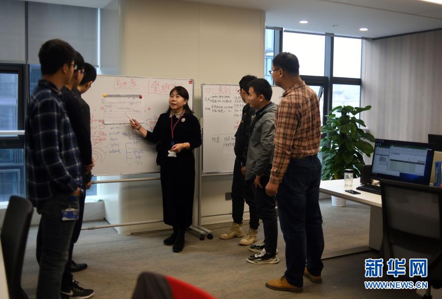 中汽創(chuàng)智科技有限公司燃料電池首席技術(shù)官王英(中)與同事交流(11月6日攝)。新華社記者 金良快 攝