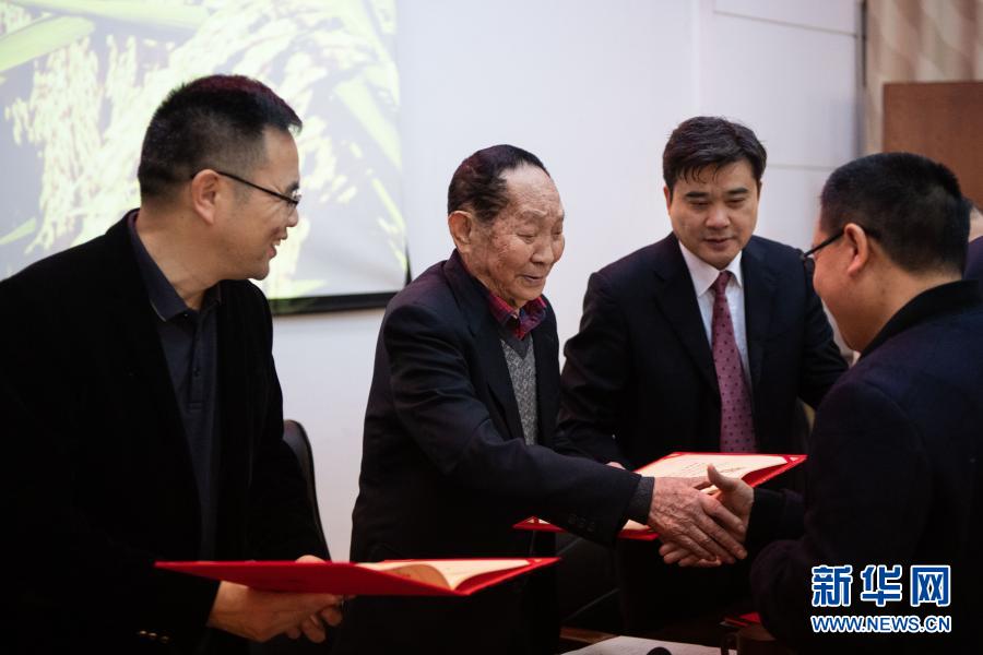 11月13日,在湖南雜交水稻研究中心舉行的“袁隆平農(nóng)業(yè)科技獎(jiǎng)”頒獎(jiǎng)儀式上,袁隆平(左二)給獲獎(jiǎng)人員頒獎(jiǎng)。新華社記者 陳思汗 攝