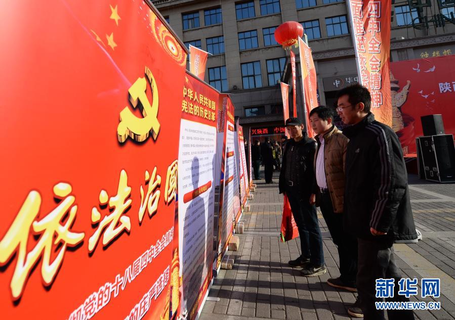 西安市民在國家憲法日宣傳活動現(xiàn)場觀看依法治國宣傳展板(2014年12月4日攝)。新華社記者 李一博 攝