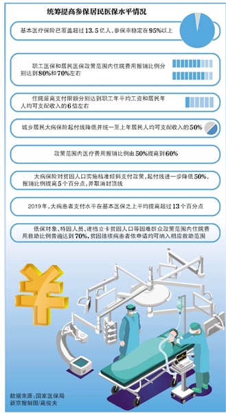 城鄉(xiāng)居民大病保險起付線降低并統(tǒng)一至上年居民人均可支配收入的50%,政策范圍內(nèi)醫(yī)療費用報銷比例由50%提高到60%。同時,大病保險對貧困人口實施精準傾斜支付政策,起付線進一步降低50%,報銷比例提高5個百分點,并取消封頂線。2019年,大病患者支付水平在基本醫(yī)保之上平均提高超過13個百分點。