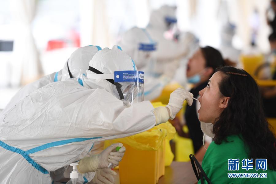 醫(yī)護(hù)人員在大連市人民路小學(xué)核酸檢測(cè)采樣點(diǎn)為市民采集咽拭子(7月27日攝)。新華社記者 龍雷 攝
