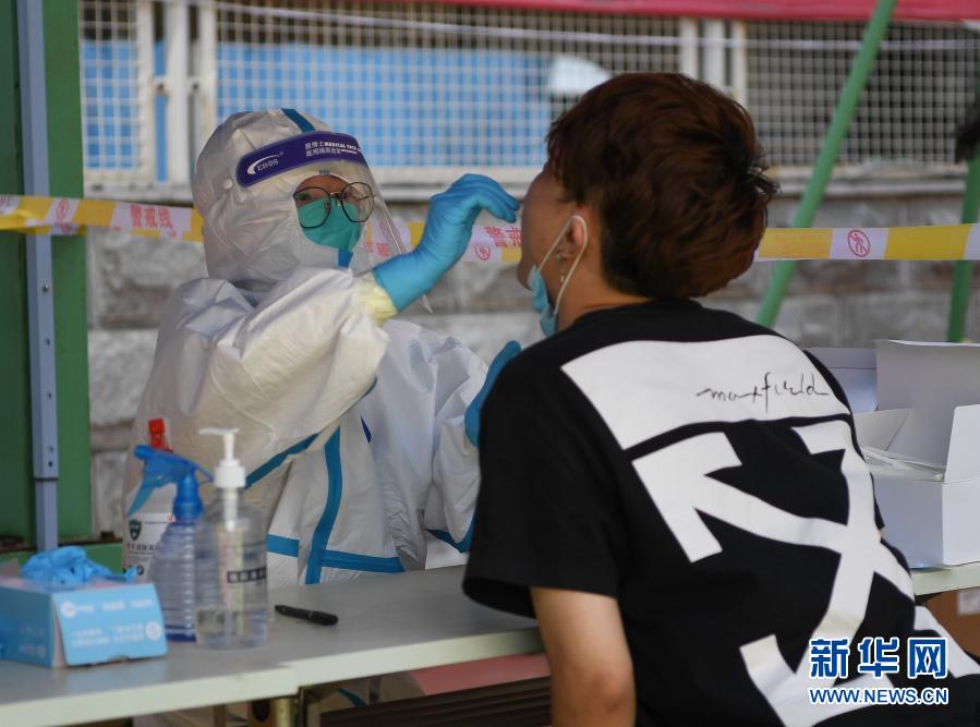 在北京市西城區(qū)北京展覽館南側(cè)的露天廣場(chǎng)核酸檢測(cè)采樣點(diǎn),醫(yī)護(hù)人員為前來(lái)做檢測(cè)的人員進(jìn)行采樣(6月28日攝)。新華社記者 鞠煥宗 攝