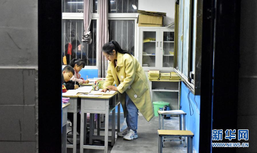 11月17日晚,在河南省洛陽(yáng)市嵩縣德亭鎮(zhèn)酒店小學(xué),王予川檢查學(xué)生作業(yè)。新華社記者 韓朝陽(yáng) 攝