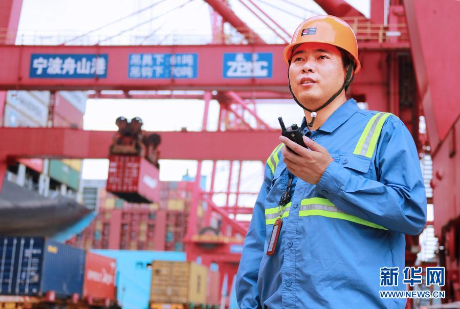 寧波舟山港北侖第三集裝箱碼頭有限公司橋吊班大班長(zhǎng)竺士杰在寧波舟山港碼頭工作(資料照片)。新華社發(fā)