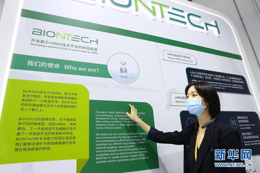11月5日,在第三屆中國國際進(jìn)口博覽會上,工作人員在醫(yī)療器械及醫(yī)藥健康展區(qū)介紹由復(fù)星醫(yī)藥與德國拜恩泰科合作開發(fā)的新冠病毒mRNA(信使核糖核酸)疫苗。新華社記者 張玉薇 攝