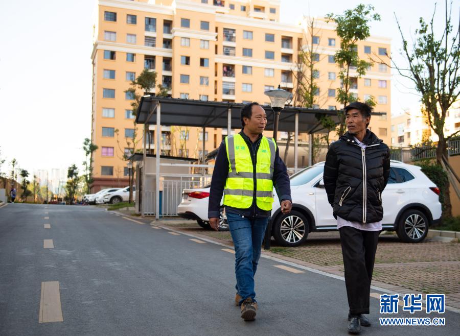 馮登友(左)在云南省鎮(zhèn)雄縣魯家院子易地扶貧搬遷安置點(diǎn)巡邏時與搬遷群眾聊天(11月10日攝)。新華社記者 王冠森 攝