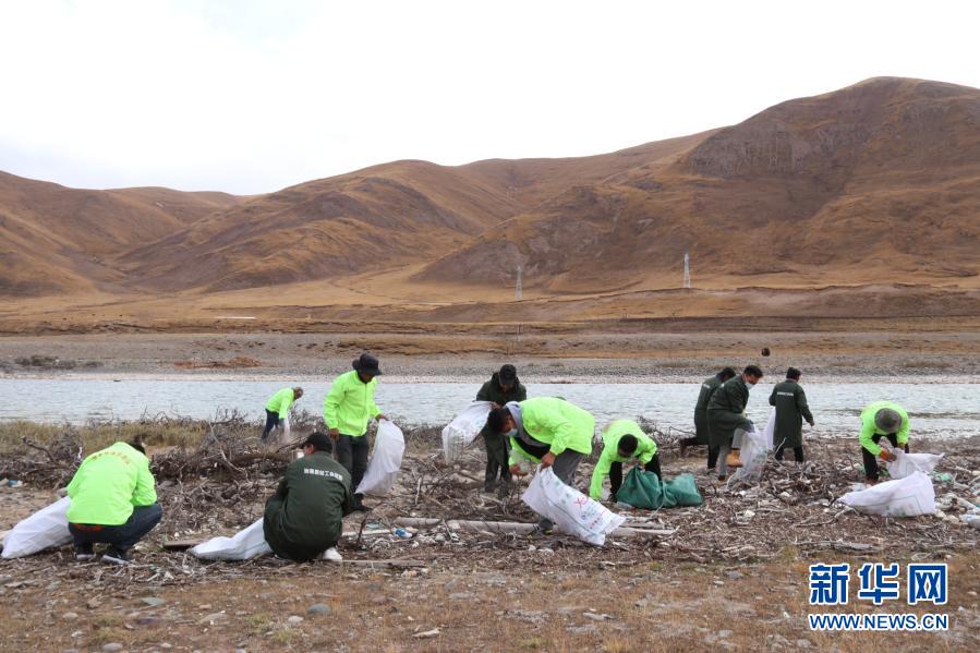三江源國(guó)家公園治多生態(tài)環(huán)保協(xié)會(huì)的志愿者在清理河道內(nèi)的垃圾(7月11日攝)。新華社發(fā)