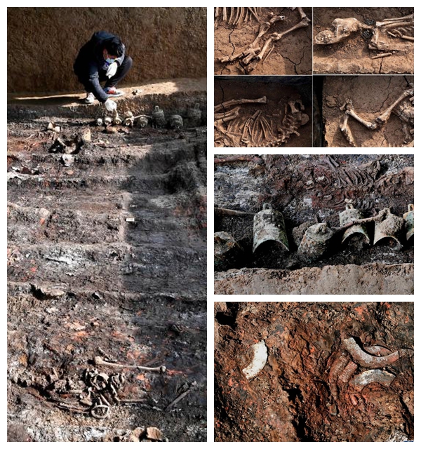 左圖為工作人員在清理河南洛陽徐陽墓地標(biāo)號為M15的墓葬;右上圖為河南洛陽徐陽墓地標(biāo)號為M15的墓葬周邊祭祀遺存內(nèi)出土的動物遺??;右中圖為河南洛陽徐陽墓地標(biāo)號為M15的墓葬出土的編鐘;右下圖為河南洛陽徐陽墓地標(biāo)號為M15的墓葬出土的玉璜