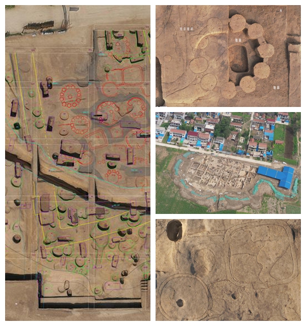 左圖為河南時莊遺址遺跡分布圖;右上圖為時莊遺址地上糧倉俯拍圖;右中圖為河南淮陽時莊遺址全景(無人機(jī)照片);右下圖為時莊遺址發(fā)現(xiàn)的圓形及圓角方形倉儲遺跡(上為北)