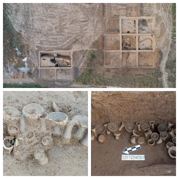 上圖為余莊遺址發(fā)掘區(qū)航拍圖(11月3日攝,無人機(jī)照片);左下圖為余莊遺址標(biāo)號為T0405的探方出土的陶器;右下圖為余莊遺址標(biāo)號為M10的墓葬出土的隨葬陶器
