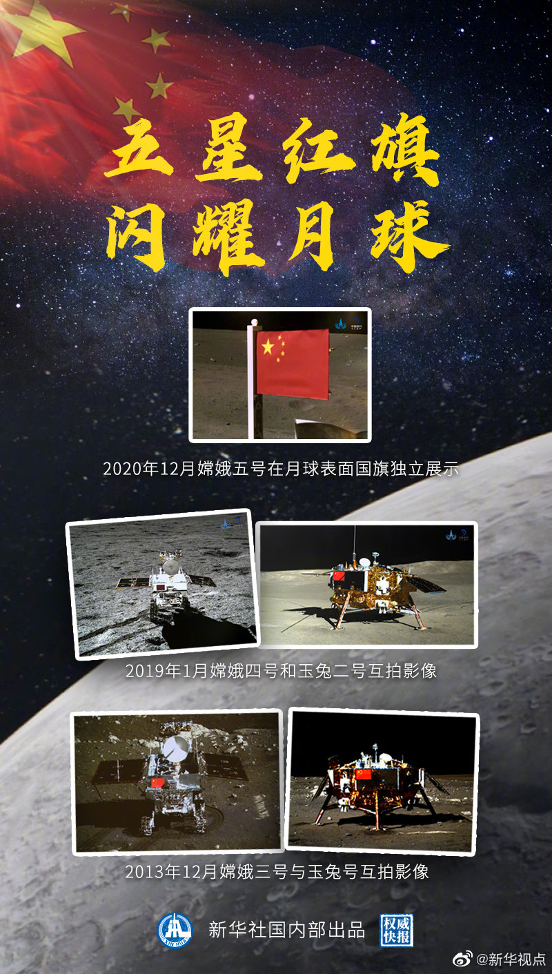 經(jīng)過科研團(tuán)隊的數(shù)據(jù)接收和處理,4日下午,國家航天局公布了探月工程嫦娥五號探測器在月球表面國旗獨立展示的照片。這是繼嫦娥三號、四號任務(wù)后,五星紅旗又一次展現(xiàn)在月球表面。畫面中,鮮艷的五星紅旗格外耀眼。轉(zhuǎn)發(fā),祝福祖國!??