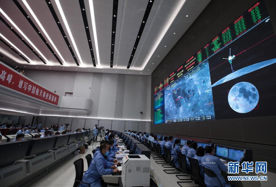 12月6日,航天科技人員在北京航天飛行控制中心指揮大廳監(jiān)測嫦娥五號上升器在軌將月球樣品容器轉(zhuǎn)移至返回器情況。