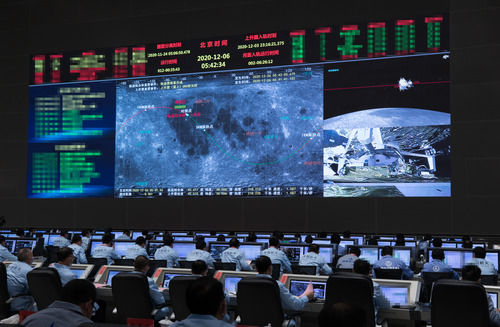 12月6日,航天科技人員在北京航天飛行控制中心指揮大廳監(jiān)測嫦娥五號上升器與軌道器返回器組合體交會對接情況。新華社記者 金立旺 攝