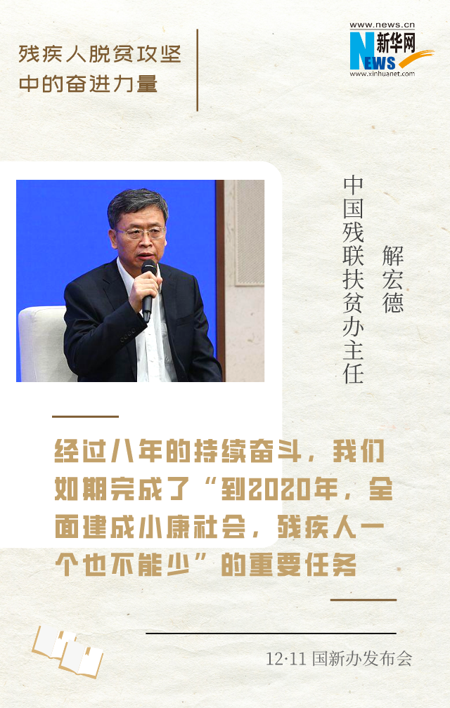 解宏德是中國殘聯(lián)扶貧辦主任。五年來,全程參與了殘疾人脫貧攻堅(jiān)工作。他介紹,在殘疾人脫貧攻堅(jiān)這條戰(zhàn)線上,各級殘聯(lián)組織將殘疾人脫貧攻堅(jiān)作為最重要、最緊迫、最艱巨的一項(xiàng)政治任務(wù)來抓。經(jīng)過八年的持續(xù)奮斗,我國將如期完成“到2020年,全面建成小康社會,殘疾人一個(gè)也不能少”的重要任務(wù),現(xiàn)行標(biāo)準(zhǔn)下農(nóng)村貧困殘疾人將如期全部脫貧,消除殘疾人絕對貧困。