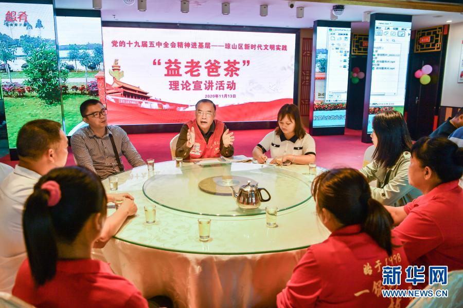 11月13日,海南省海口市瓊山區(qū)紅城湖邊的一家老爸茶館內(nèi),退休老干部郭仁忠在宣講黨的十九屆五中全會(huì)精神。新華社發(fā)(龍泉 攝)