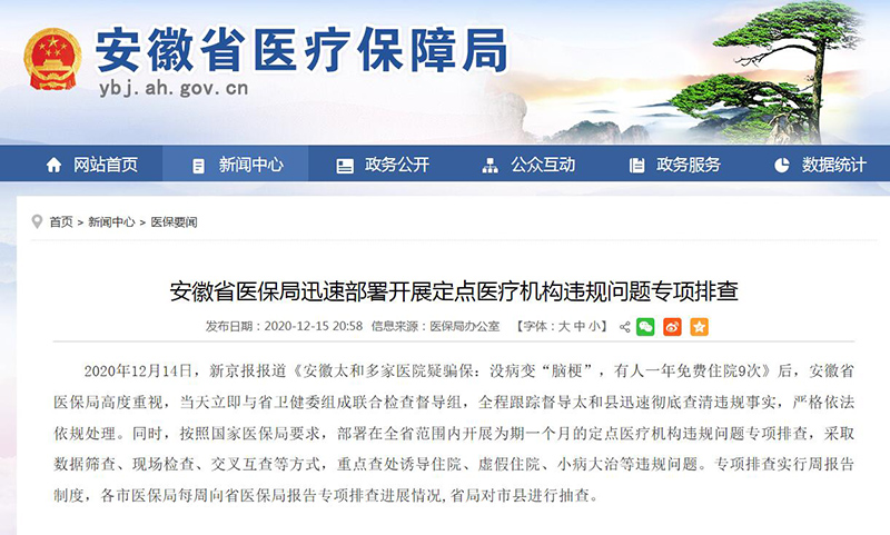 據(jù)安徽省醫(yī)保局網(wǎng)站消息,2020年12月14日,新京報報道《安徽太和多家醫(yī)院疑騙保:沒病變“腦?!?,有人一年免費住院9次》后,安徽省醫(yī)保局高度重視,當天立即與省衛(wèi)健委組成聯(lián)合檢查督導組,全程跟蹤督導太和縣迅速徹底查清違規(guī)事實,嚴格依法依規(guī)處理。
