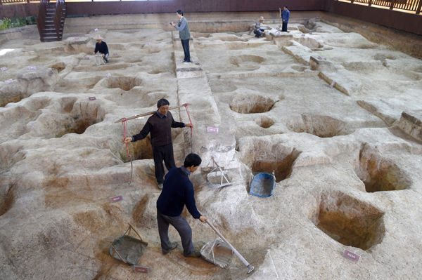 上山考古遺址公園內發(fā)掘原址上的考古現(xiàn)場情景再現(xiàn)。韓傳號?攝