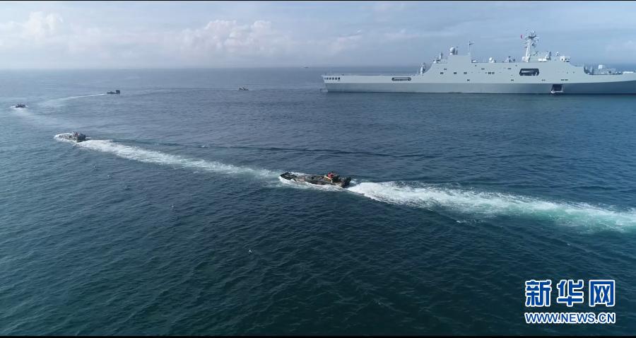 陸軍第72集團(tuán)軍某旅組織海上駕駛訓(xùn)練,戰(zhàn)車按協(xié)同隊(duì)形依次駛上海軍登陸艦(2018年8月16日攝,無(wú)人機(jī)照片)。新華社發(fā)(莊林毅 攝)