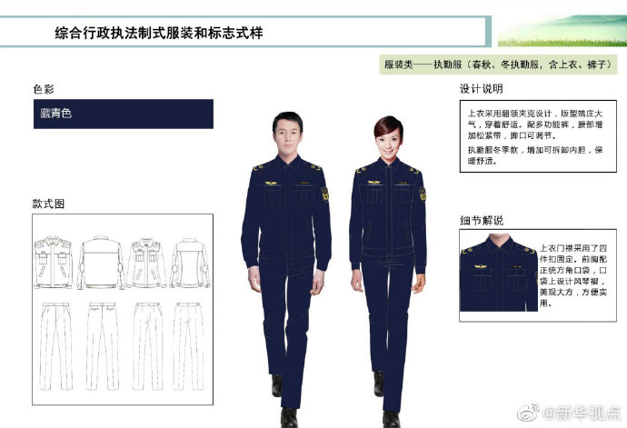 【這些綜合行政執(zhí)法部門將統(tǒng)一著裝,你喜歡嗎?】財政部、司法部日前印發(fā)《綜合行政執(zhí)法制式服裝和標志管理辦法》,明確加強生態(tài)環(huán)境保護、交通運輸、農業(yè)、文化市場、應急管理、市場監(jiān)管等綜合行政執(zhí)法制式服裝和標志管理。這6支綜合行政執(zhí)法隊伍將統(tǒng)一著裝,不同執(zhí)法隊伍通過標志中的名稱和圖案加以區(qū)分,徹底解決長期以來不同執(zhí)法部門著裝五花八門的問題。來看看這些“新衣”預覽吧!(記者申鋮、白陽)