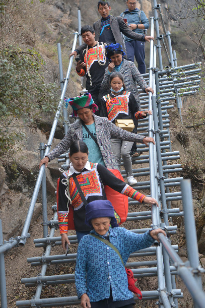 ????2020年5月13日,四川省涼山州昭覺縣支爾莫鄉(xiāng)阿土列爾村31戶村民帶著行李通過鋼梯下山,集中搬遷至昭覺縣易地扶貧搬遷縣城集中安置點的新家。阿土列爾村因位于垂直落差上千米的陡峭懸崖上,曾經(jīng)村民上下山都要在巖壁上攀爬,從而被稱為“懸崖村”。5月14日前,全村84戶建檔立卡貧困戶將陸續(xù)搬進(jìn)縣城新家。張浪 攝