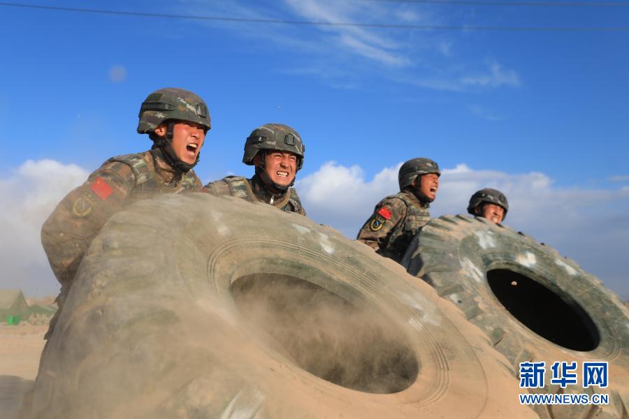 武警新疆總隊(duì)某機(jī)動(dòng)支隊(duì)特戰(zhàn)一中隊(duì)組織官兵進(jìn)行翻輪胎體能訓(xùn)練(10月30日攝)。新華社發(fā)(張文 攝)