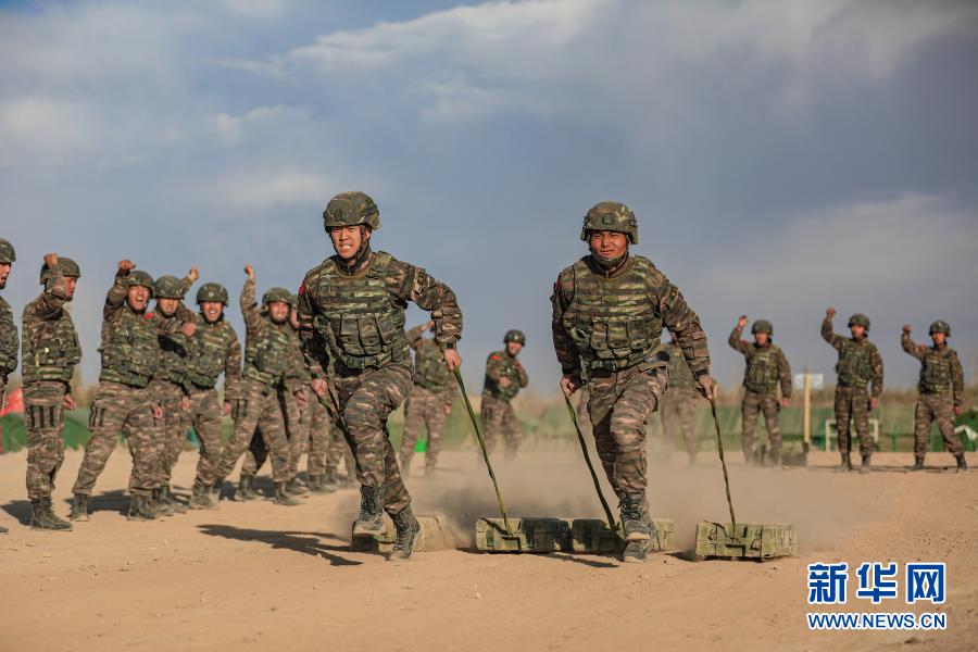 武警新疆總隊(duì)某機(jī)動(dòng)支隊(duì)特戰(zhàn)一中隊(duì)組織官兵進(jìn)行搬運(yùn)子彈箱體能訓(xùn)練(10月30日攝)。新華社發(fā)(張文 攝)
