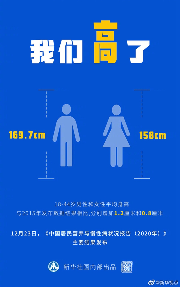 你的營(yíng)養(yǎng)和健康情況怎樣?高了?身體倍棒?12月23日,一份關(guān)乎你我的健康大數(shù)據(jù)重磅上新,《中國(guó)居民營(yíng)養(yǎng)與慢性病狀況報(bào)告(2020年)》主要結(jié)果發(fā)布——成人平均身高繼續(xù)增長(zhǎng),營(yíng)養(yǎng)不足問(wèn)題得到改善,健康意識(shí)逐步增強(qiáng)。(記者:陳聰,海報(bào)設(shè)計(jì):張晨光) ????