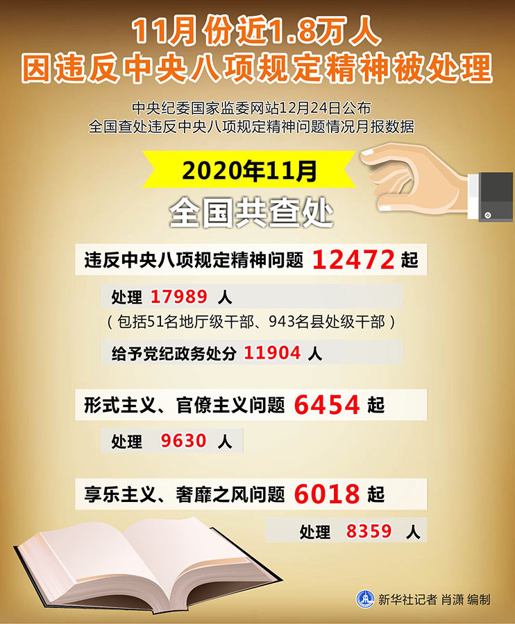 新華社北京12月24日電(記者孫少龍)中央紀(jì)委國(guó)家監(jiān)委網(wǎng)站24日公布全國(guó)查處違反中央八項(xiàng)規(guī)定精神問(wèn)題情況月報(bào)數(shù)據(jù)。通報(bào)顯示,2020年11月,全國(guó)共查處違反中央八項(xiàng)規(guī)定精神問(wèn)題12472起,處理17989人(包括51名地廳級(jí)干部、943名縣處級(jí)干部),給予黨紀(jì)政務(wù)處分11904人。