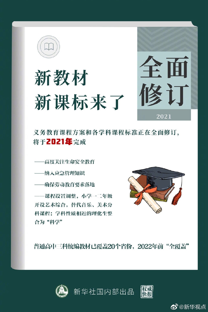中小學(xué)校開什么課?學(xué)什么?怎么學(xué)?12月24日,教育部召開新聞發(fā)布會(huì)介紹,義務(wù)教育課程方案和各學(xué)科課程標(biāo)準(zhǔn)正在全面修訂,將于2021年完成。此外,普通高中道德與法治(思想政治)、語(yǔ)文、歷史三科統(tǒng)編教材已覆蓋20個(gè)省份,2022年前將實(shí)現(xiàn)所有省份“全覆蓋”,到2025年實(shí)現(xiàn)所有年級(jí)“全覆蓋”。(記者胡浩 海報(bào)設(shè)計(jì)張晨光)