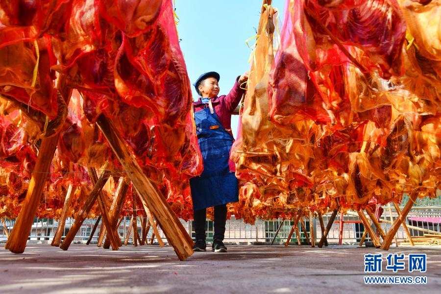 在江西省興國縣楓邊鄉(xiāng)密石村,一名村民在制作臘鴨(12月21日攝)。新華社發(fā)(陳鵬 攝)