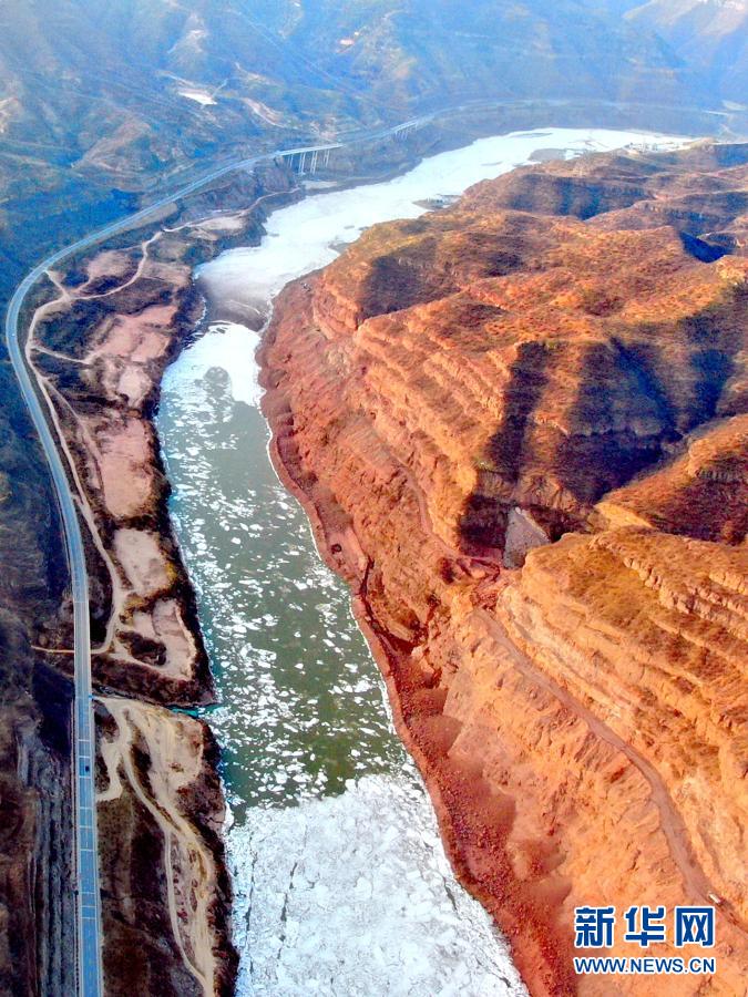 壺口瀑布至龍門水文站之間的黃河(12月26日攝,無人機照片)。新華社記者 劉詩平 攝