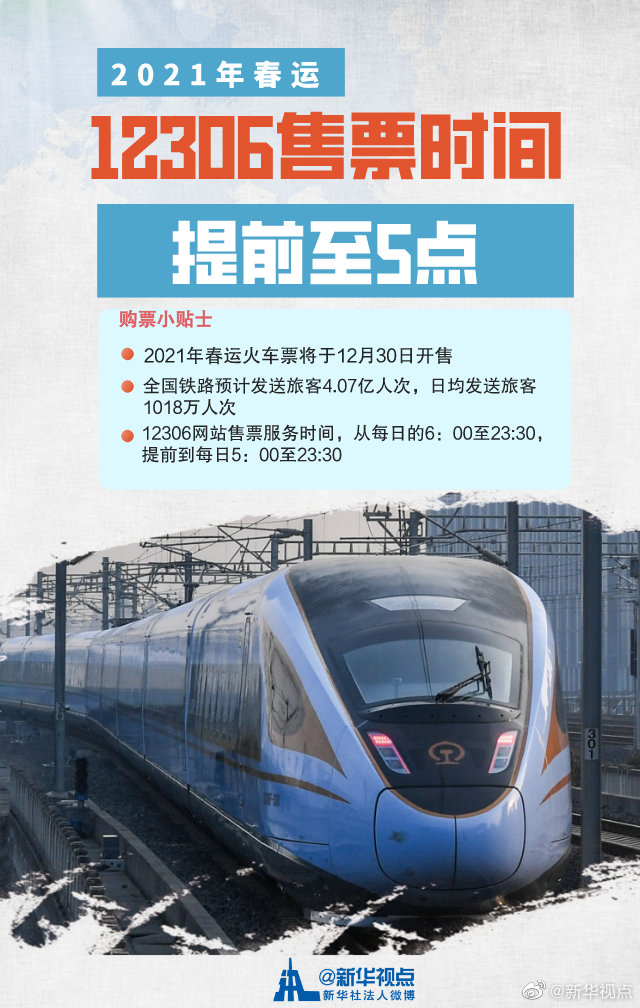 2021年鐵路春運自1月28日開始,3月8日結(jié)束,共40天,全國鐵路預計發(fā)送旅客4.07億人次,日均發(fā)送旅客1018萬人次。據(jù)悉,鐵路部門將鐵路12306網(wǎng)站售票服務時間從每日的6:00至23:30,提前到每日5:00至23:30;同步12306網(wǎng)站和線下窗口改簽規(guī)則,線上也可改簽乘車當日24點前其他列車車票。(記者樊曦、周圓)?