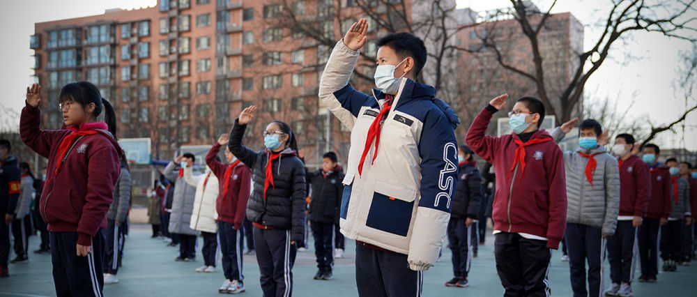 在北京四中廣外校區(qū),蔡昊霖(前)和同學一起參加升旗儀式(12月21日攝)。